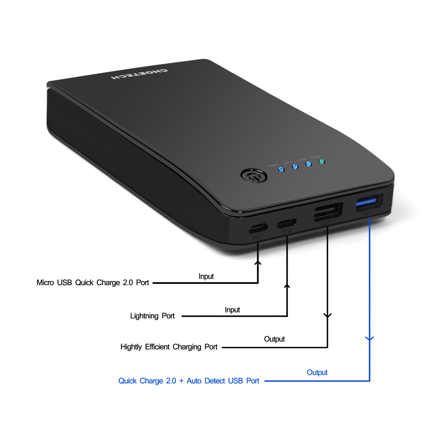 The device offers 15600mAh and input ports, 1 micro USB and 1 Apple Lightening, which is very convenient if you want to share the device amongst lightening and non-lightening users. The micro USB input is rated at 5V/2.1A, 9V/1.5A while the Lightening offers 5V/2.1A. In addition there are two output ports, a regular 5V/1A USB and an auto detect USB 5V/2.4A, 9V/1.7A, 12V/1.3A. Its nice to have the multipe output ports for those times you need to charge more than one device at a time.